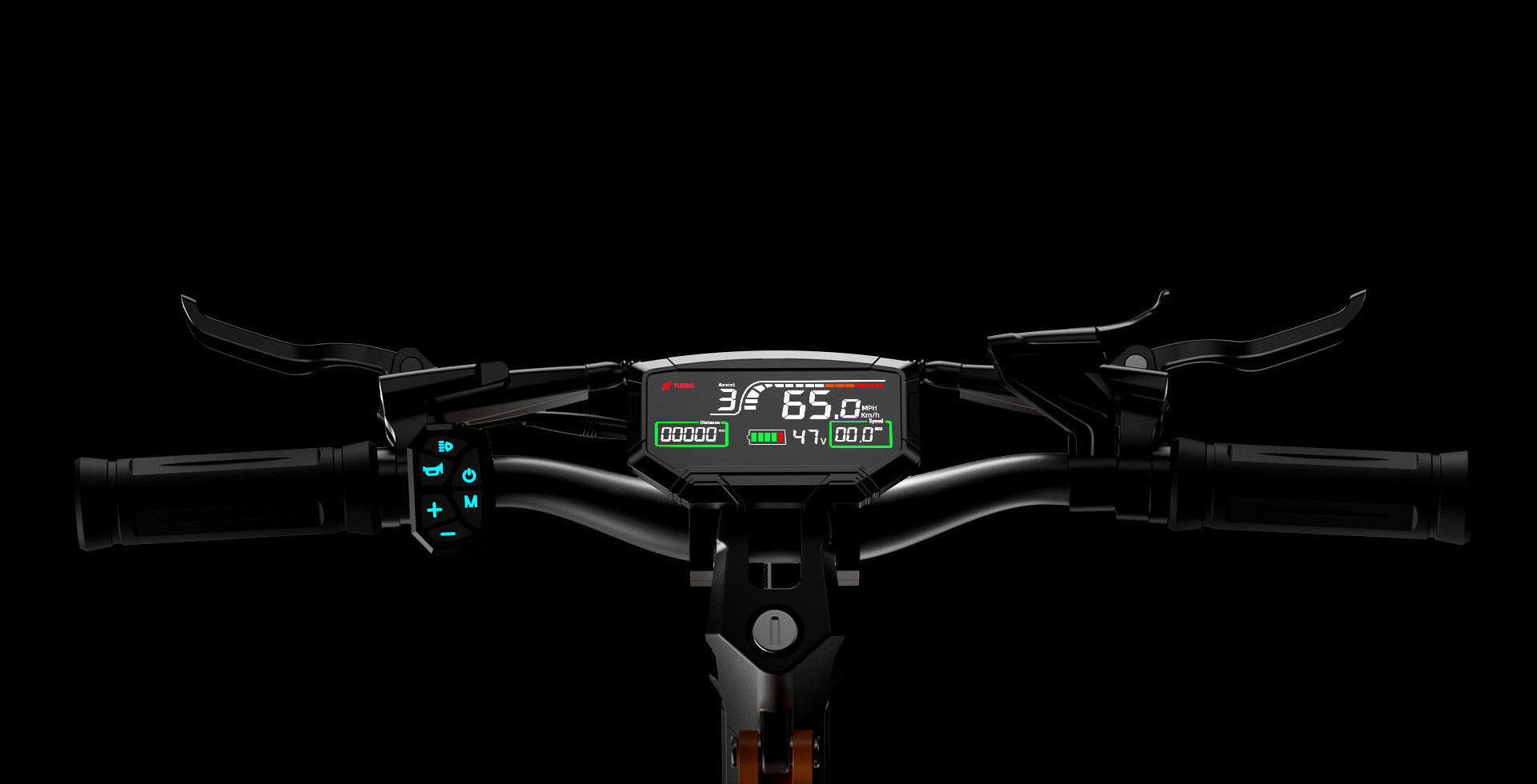 Smart LED dashboard displays speed, mode, and battery in full color — all controlled with a single touch.